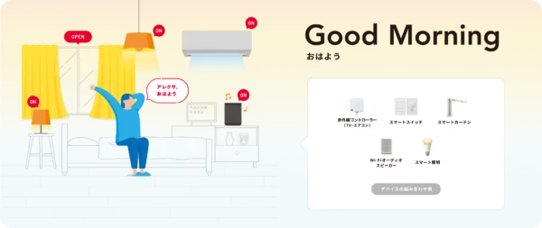 外出時には「行ってきます」と声をかければ、エアコンやテレビ、給湯器、照明などが自動でオフになり、カーテンは閉じてくれるよう設定できます。