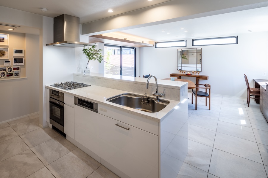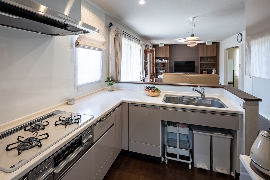 シンクとコンロが完全に分離しているため、家事動線が短くなるほか、収納スペースが増えていることも強みです。整理整頓がしやすく、キッチン回りがすっきりします。
