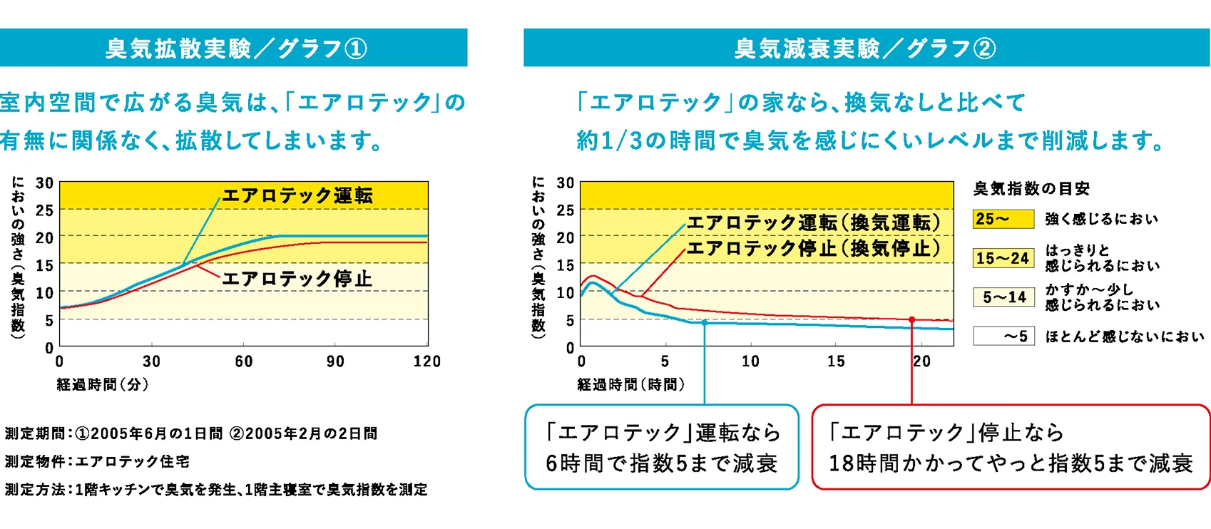 24時間空気を循環しつづける「エアロテック」なら運転停止の状態に比べ、約1/3の時間で人がほとんど臭いを感じない状態まで回復することができます。