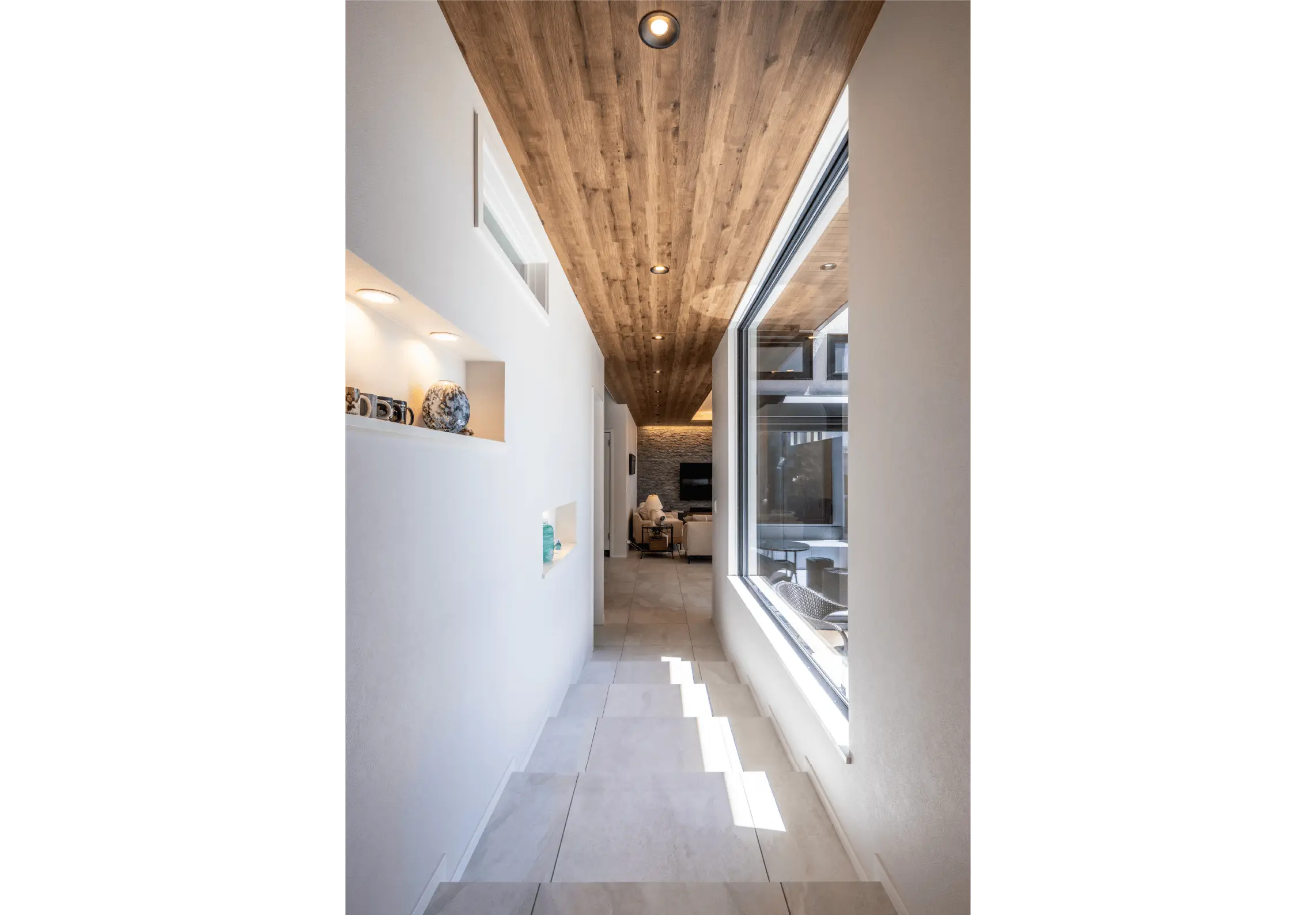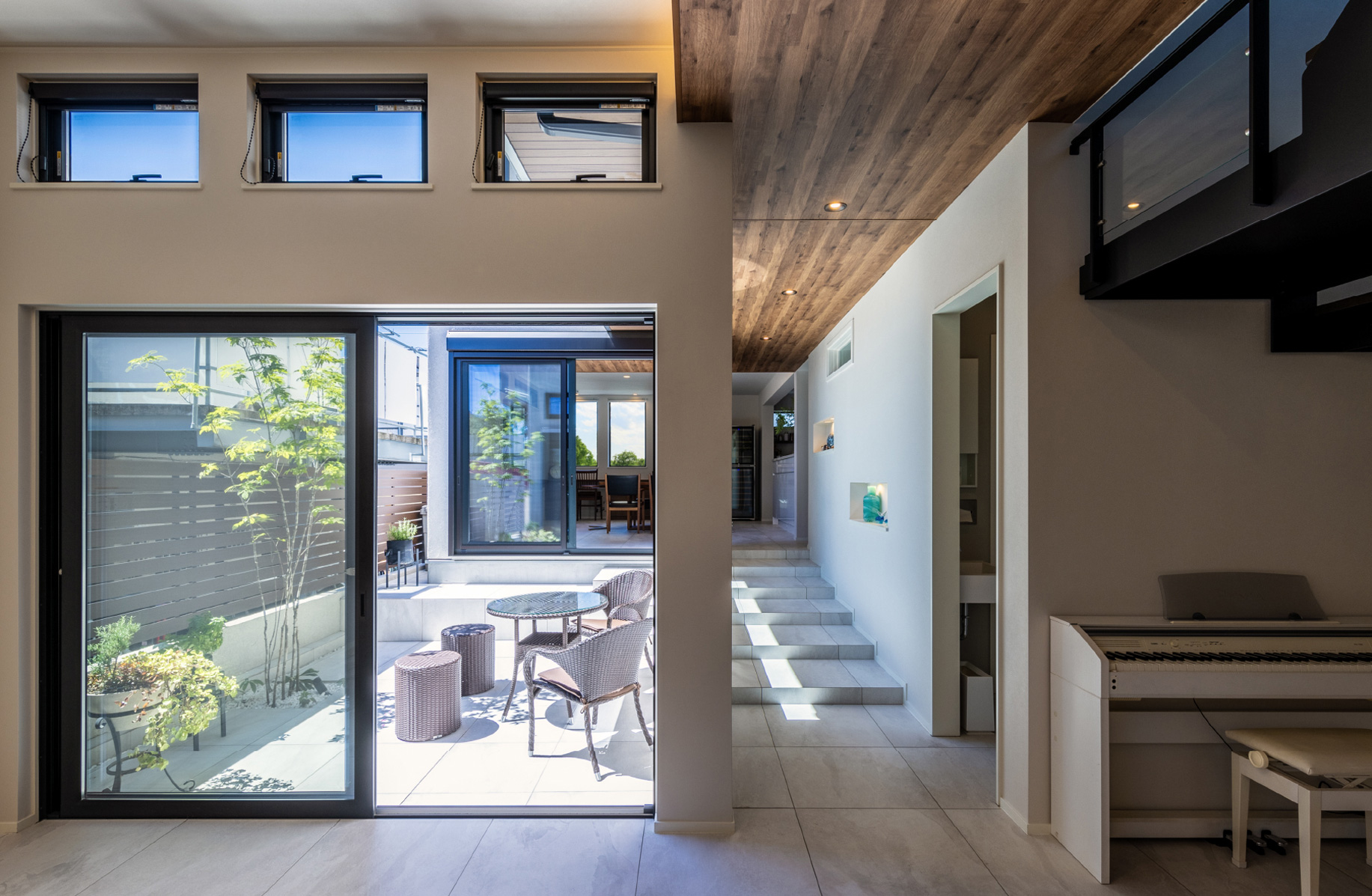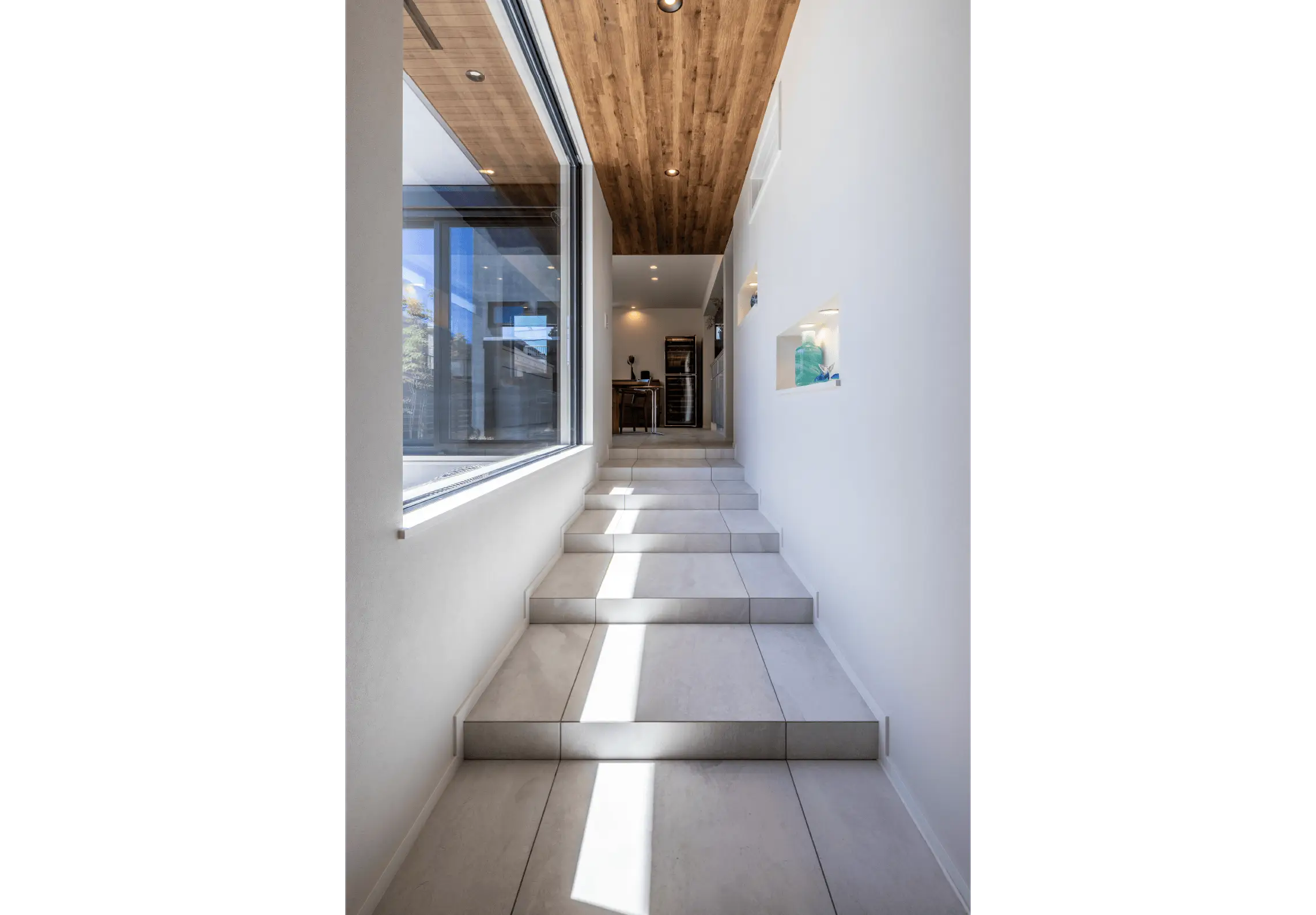 リビングとつながる廊下は、ギャラリーとして「見せる空間」に。敷地内の段差を生かして設けられた緩やかな階段が、パティオを望む大きな窓とともに豊かな表情を生み出しています。
