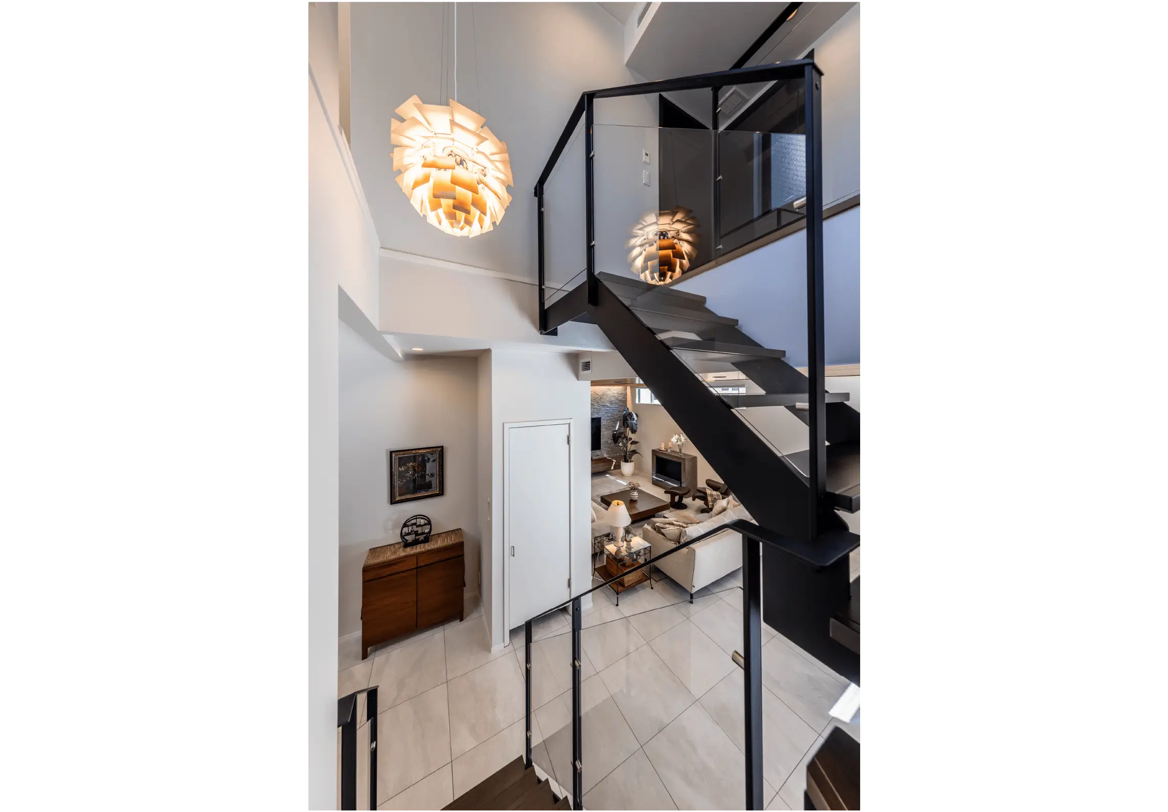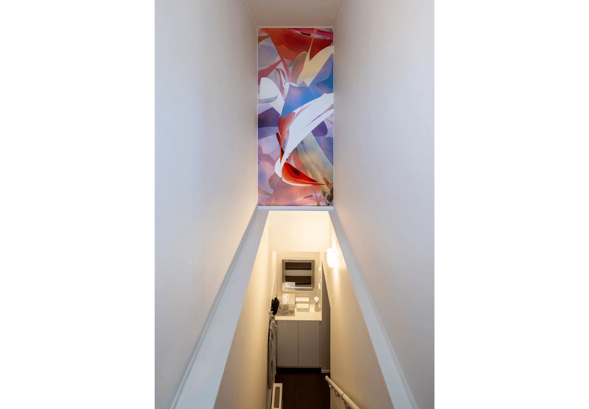 ダイニングからガレージに降りる階段も、あまり人目につかない場所ですが、あえてアートな壁紙をオーダーし、日常のアクセントとして楽しんでいるそうです。