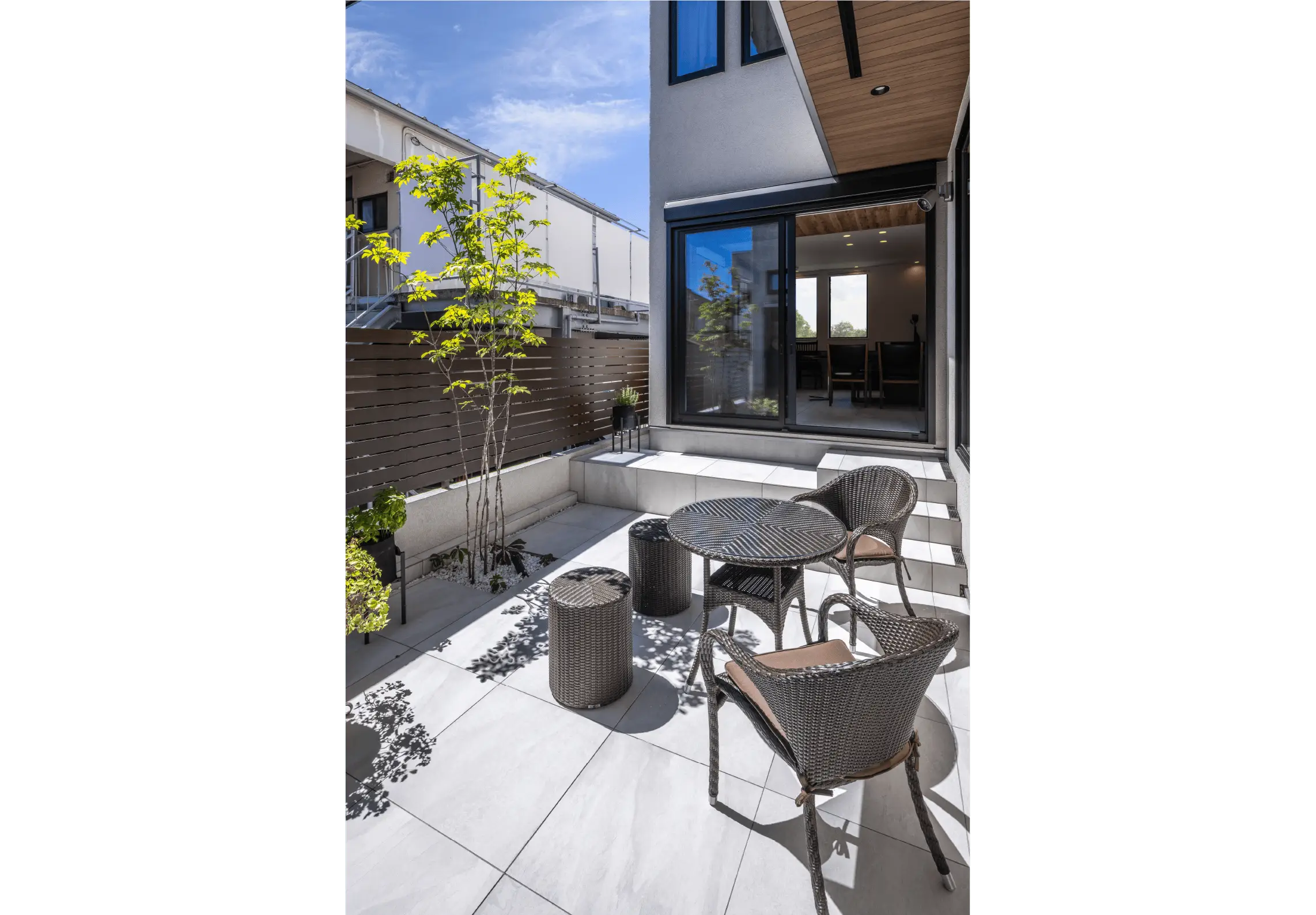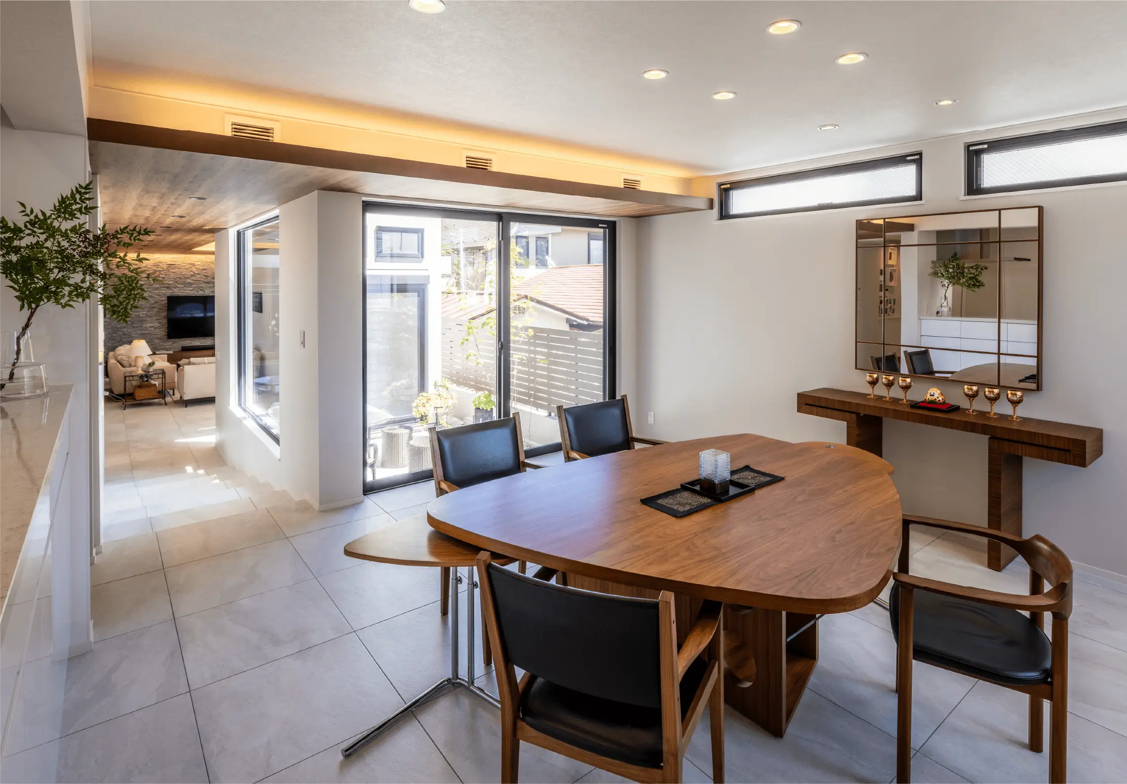 シンボルツリーのアオダモが柔らかい新芽を伸ばすパティオ。その景色を囲むようにダイニングとリビングが向かい合う配置は、ご夫妻のこだわり。