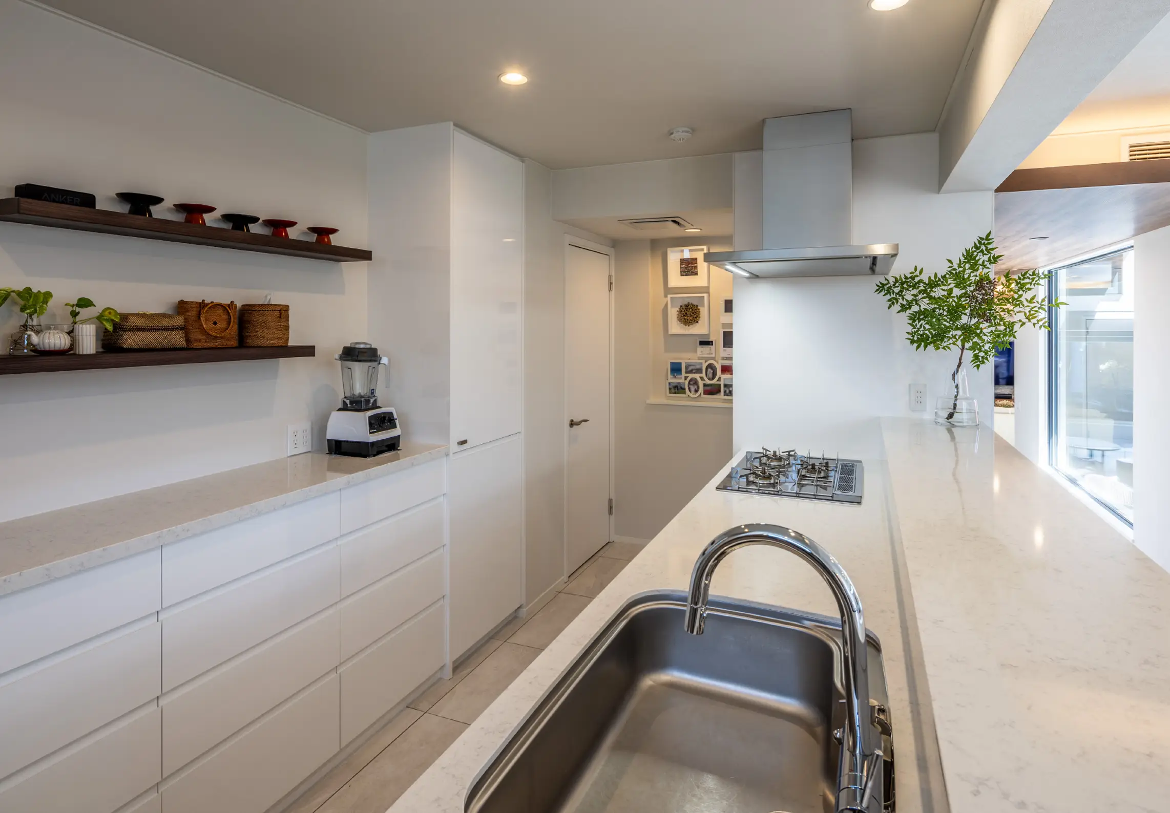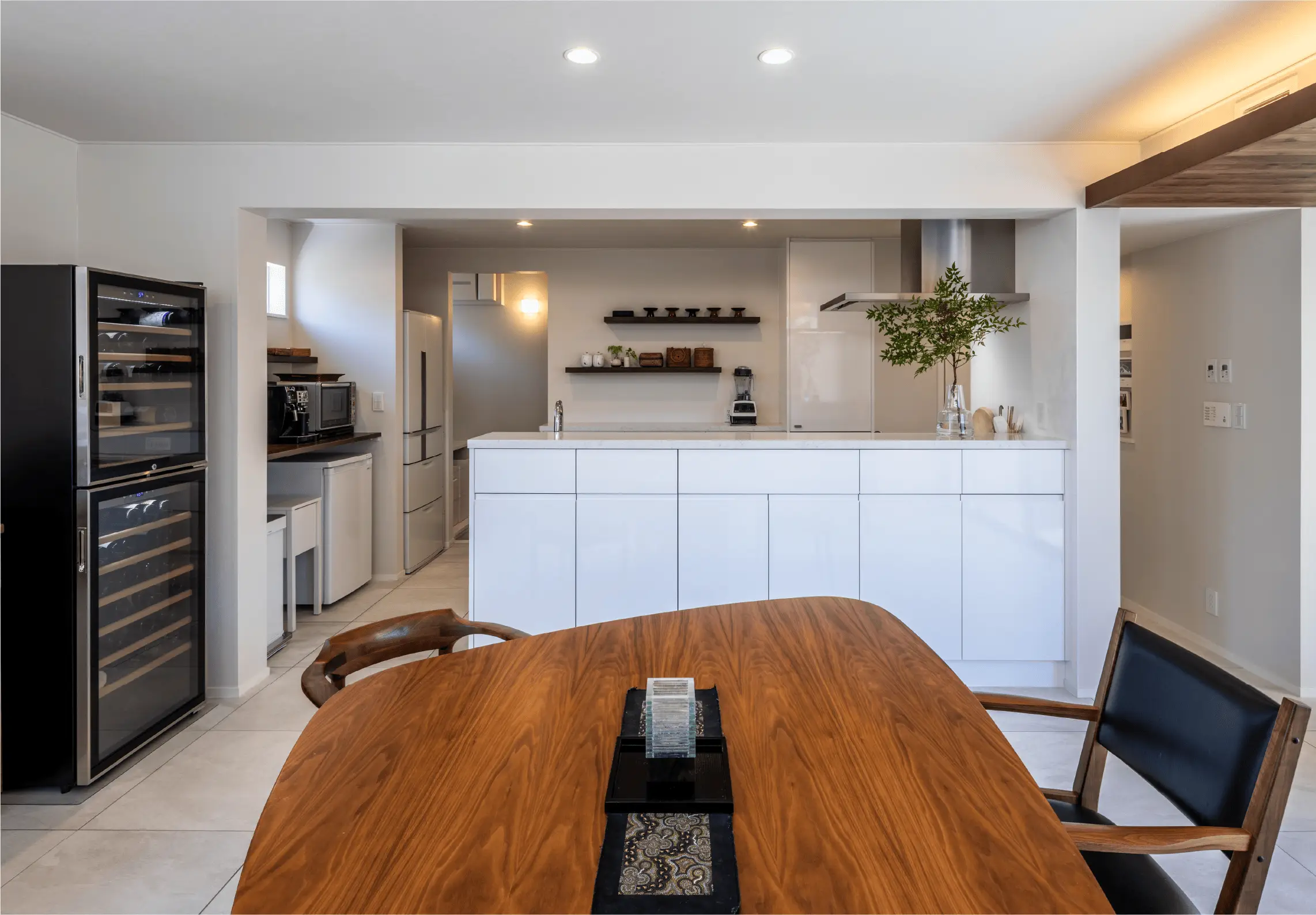 「前の家では吊り戸棚も使っていましたが、これから年齢を重ねていくと、高いところからものを出し入れすることは、どんどんしなくなるだろうと思いました。手が届く範囲の収納を充実させて、その分、飾り棚で遊べるようにしたんです」