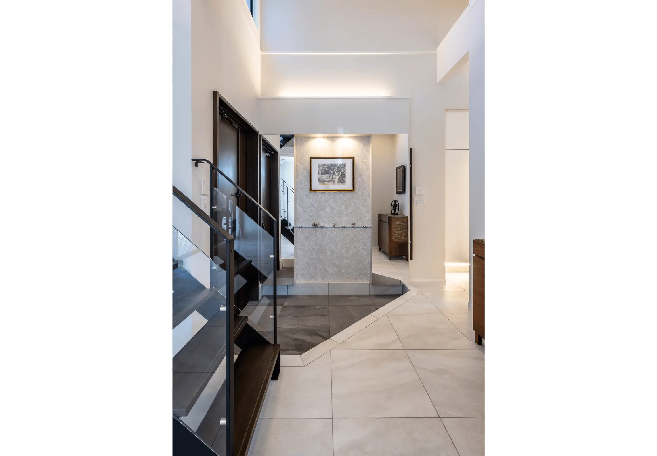 「廊下の幅が120cmなので、60cm幅のタイル2枚でぴったり収まると思っていました。ところが、それだと床の真ん中に目地の直線が入ってしまうことに妻が気づき、3枚の構成に変えてもらったんです。ちょっとした違いですが、空間に広がりが感じられるので、こだわっておいてよかった」とご主人。