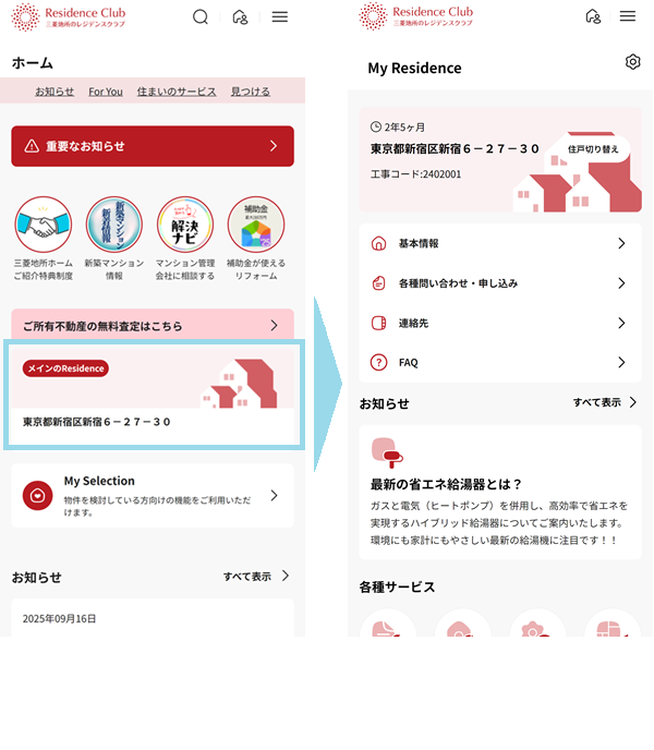 ログイン後、「三菱地所のレジデンスクラブ」ホーム画面の「メインのResidence」(ご建築いただいたお建物の住所が表示されています)をタップすると、オーナー様マイページ「My Residence」をご覧いただけます。
