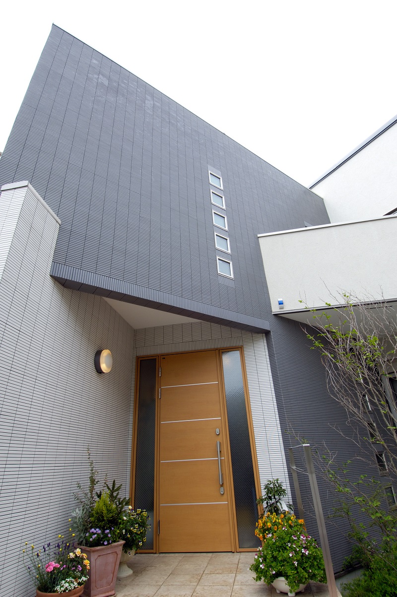 迫力のあるタイル張りの外観がスケール感を醸し出す。床や壁材、間接照明など吟味したモダンな邸宅。