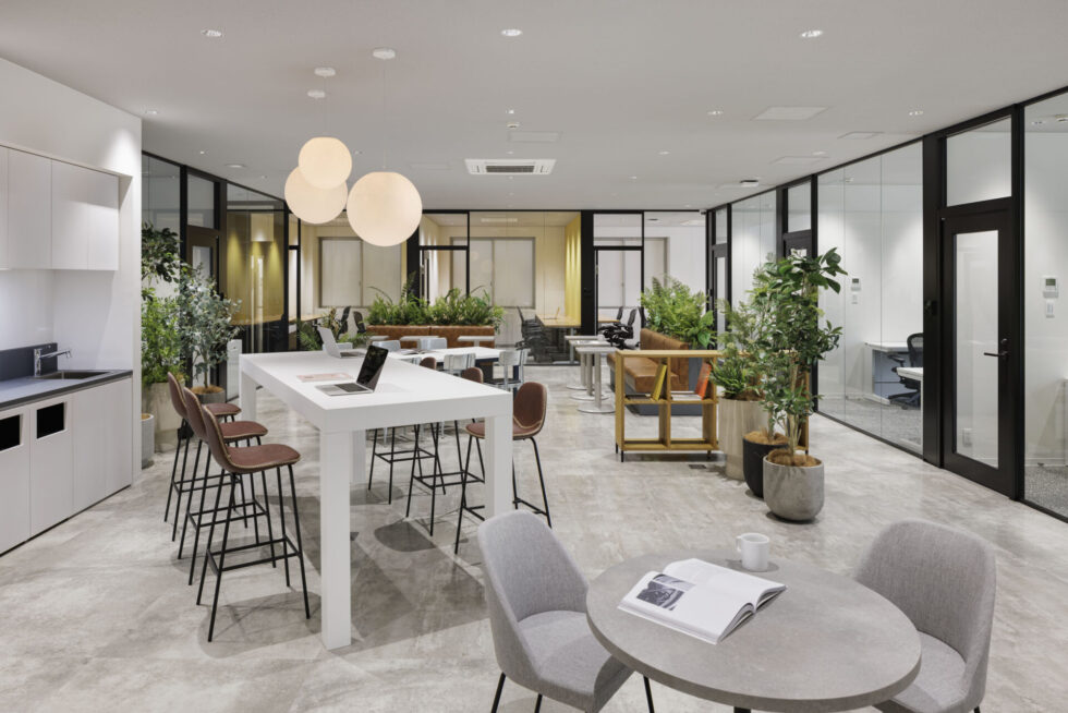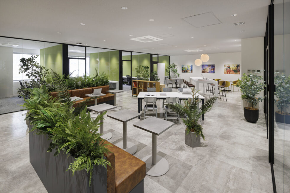 同じフロアにあるワーク・ラウンジは、個人での作業や来客との打合せ、イベントなど多様な用途に応じて柔軟に利用できる環境が整っており、さまざまな働き方とコミュニケーションを支える場として機能しています。