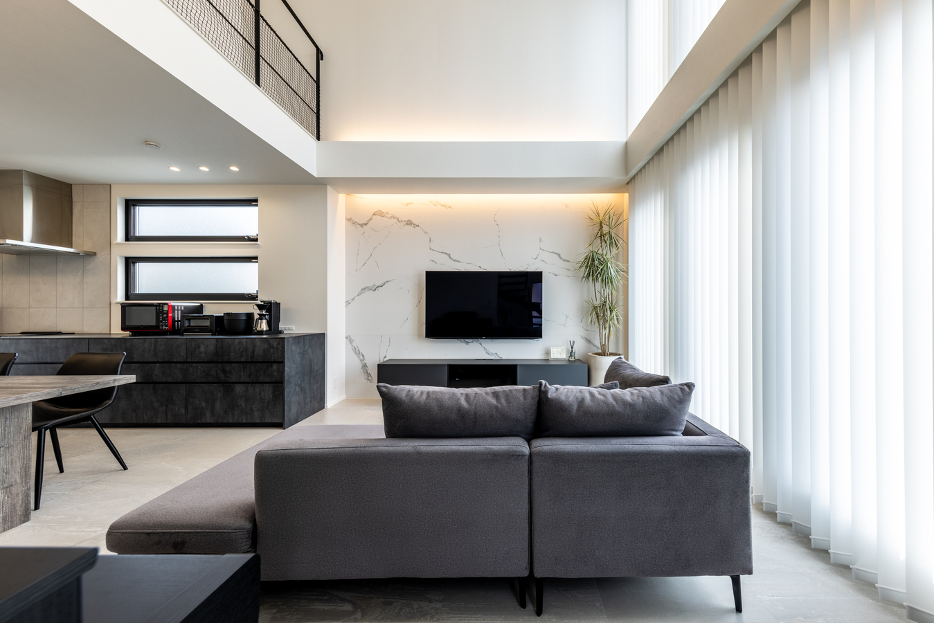 吹き抜けが空間に広がりをもたらし、リビングを開放的に見せています。