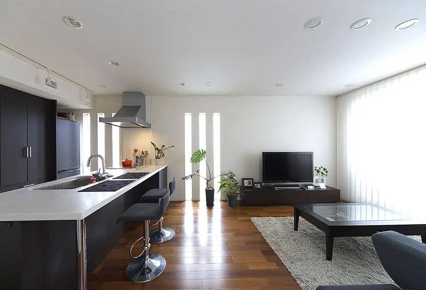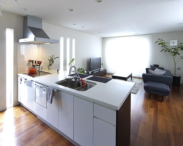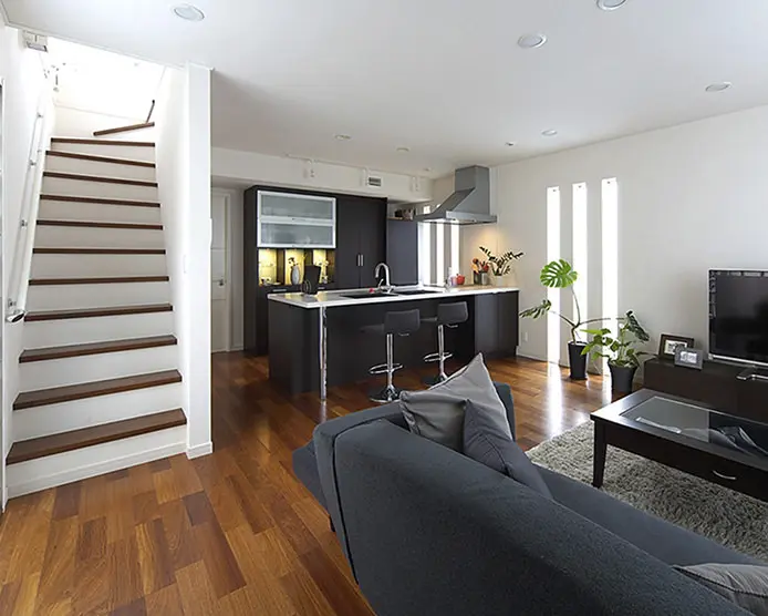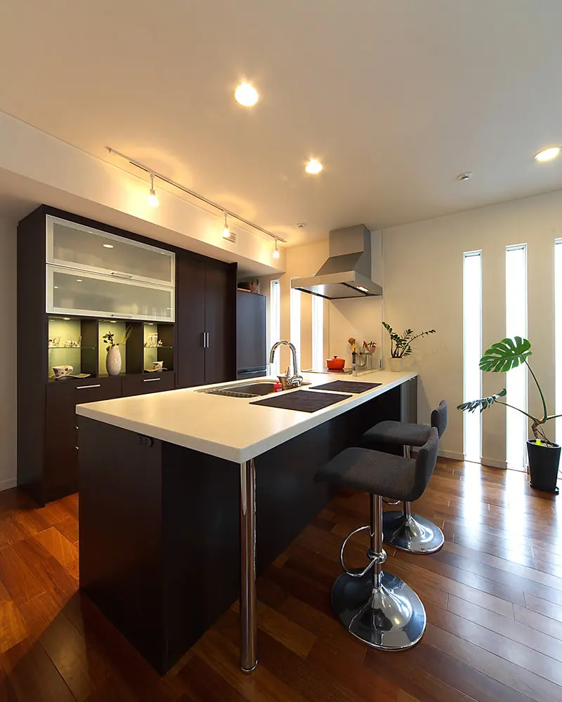 - 全館空調「エアロテック」によって、最小限の間仕切りで空間をつないだ3階建て。2階のダイニングは、キッチンカウンターを広く延ばしてテーブル兼用とし、リビングにゆとりの空間を生み出しています。
