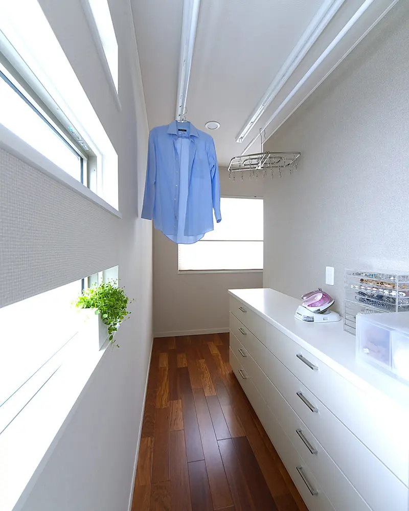- 3階には「洗濯する〜干す〜しまう」までが一気に行える、ランドリーと室内物干しと収納を兼ねたスペースを。アイロン台も設えたことで、家事効率が格段に高まりました。