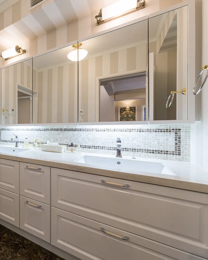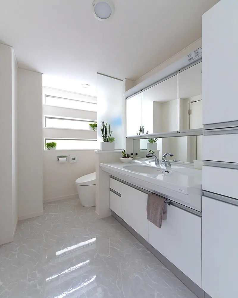 - 壁紙からタイルの貼り方まで、無限に選ばせていただけるのが楽しかったです。2ボウルの洗面台もギリギリでおさめていただくなど、きめ細かな対応力に大満足の家づくりでした。